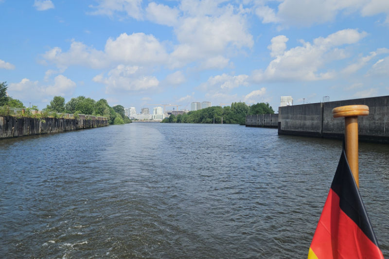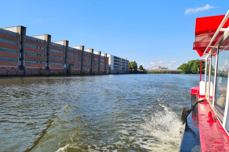 Wir schippern mitten durch das zukünftige Quartier Grasbrook. Dieses entsteht bis 2035 vis-a-vis der HafenCity, rund um den Moldau- und den Saalehafen. Gut 6.000 Menschen sollen hier einmal wohnen, dazu etwa 16.000 ihren Arbeitsplatz finden.